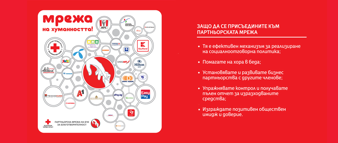 Като член на „Партньорска мрежа за благотворителност“ компанията подкрепя инициативи на Български Червен Кръст чрез предоставянето на средства и собствени продукти за подпомагане на хора в нужда в бедствени и кризисни ситуации, и при обучения и събития на БЧК.